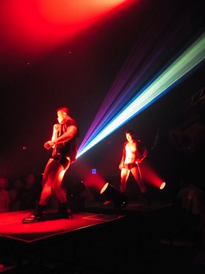 アリーナ(メインフロア)はトライバルハウス大国スペインからやって来たトップハウスDJ、CHUSがプレイ。ノリよくカッコいいトライバルサウンドが、放射状に広がる美しいレーザー光線が、そして3回にもおよぶGO-GOタイムが、"TRIBAL JOURNEY"のオーディエンスを魅了しました。『Shangri-La』が誇るGO-GO BOYSはニット帽をかぶったり、ちょっと秋らしいコスチュームも披露し(3回とも違う衣装で登場し)、ゲイも女子も熱狂させていました。ボディペインティングをほどこした外国人のお客さんたちも、いい感じにフロアを彩っていました。