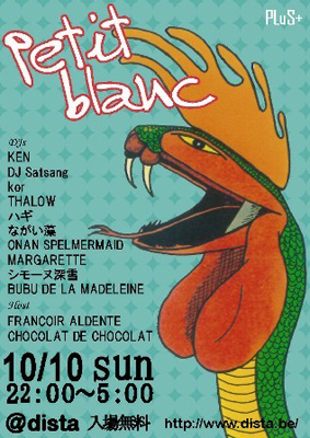 distaのdjイベントの中で、毎回驚異の集客力を誇る“BLUIT BLANC(ブリュイ・ブラン)”。ロックミュージックにこだわりを置くこのイベントは、その回ごとに切り替わる斬新なテーマとスタイルでありながら、メンバーのカラーリングの多様さなどで魅力を維持し、今なお熱狂的なファンを拡大し続けている。そのBLUIT BLANCのSpecial Dab Ver.として、『Petit Blanc PLuS+(プチブランプラス)』がPLuS+ FINALのミッドナイトを妖しく華麗に飾りあげてゆく!!ゲストdjにはPLuS+のミッドナイトならではの多彩な顔ぶれを迎え、HOTで EXCITINGなロックミュージックをお届け!!