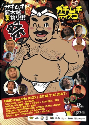 せっせと鍛えた野郎達が一斉に集う一夜、毎度超満員御礼"ガチムチ☆ディスコ"が約3年の月日を経てageHaに帰ってくる!!! 2009年にスタートして以来、東京から発信しアジア中を巻き込んで海外へガチムチ(GMD)旋風を巻き起こしている"ガチムチ☆ディスコ"が、新木場の夜を更に熱く盛り上げる!!! ガチムチアリ、人気爆裂なヌギヌギタイムアリ、ショータイムアリ、唐変木アリ、出会いアリ!!!!!今宵も歌って踊ってどんちゃん騒ぎ!新木場ageHaのガチムチディスコに大集合~!!!