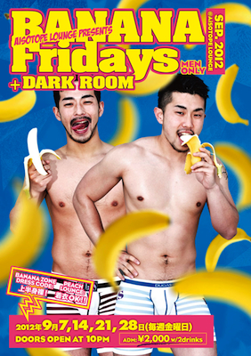 毎週金曜夜の定番、究極のBOYS’ NIGHT! バナフラに行ってみたいけど、「脱ぎ系なんでしょ!?」と尻込みしているアナタ! バナナゾーン@メインフロアは、かなり暗いので、全く気になりませんよ~ w。体系も普通体系~細筋、マッチョ、ガチムチ、ぽちゃまで。20代のピチピチ君半分、30代以上のガタイ系兄貴半分が良い感じで出会ってますw バナフラの夏限定企画、毎月第3金曜日の「ノーパン割引DAY」(¥1,000 w/1D)は9月も続行! ノーパンスウェット、ノーパンハーパン、ノーパンスラックス、ノーパン○○○…とにかくエロさ満載のノーパンFridaysを楽しんじゃお!