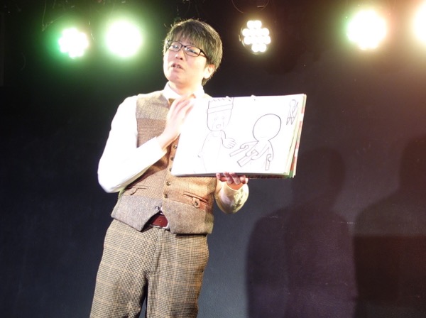 佐藤逹さんの紙芝居「僕の話をきいてください」。子どもからお年寄りまで楽しめるような、ほっこり感。それでいて冒険活劇。拍手喝采。今回も楽しませていただきました。