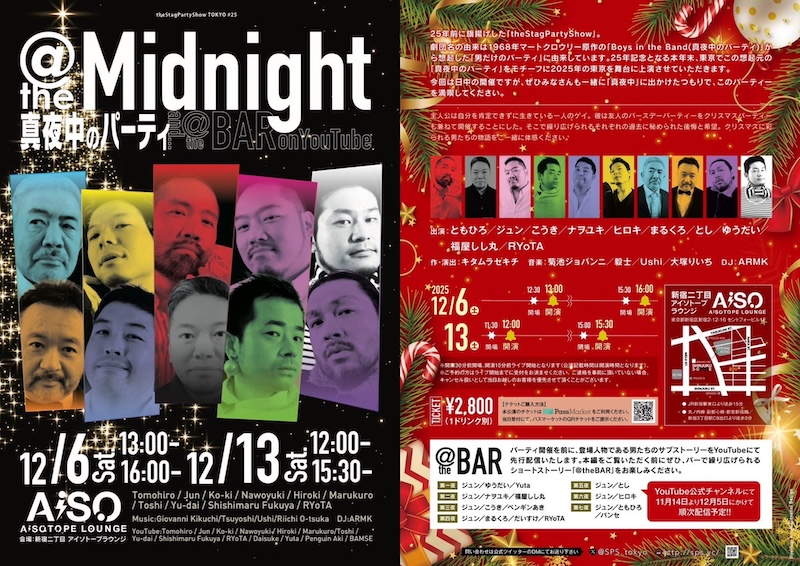25年前に旗揚げした劇団theStagPartyShow。劇団名の由来は不朽の名作『Boys in the Band(真夜中のパーティ)』https://gladxx.jp/review/cinema2/6700.htmlで、「Boys in the Band」から想起した「男だけのパーティ」という意味でtheStagPartyShowと名付けられたんだそうです。その25周年を記念して、この年末、二丁目のAiSOTOPE LOUNGEで2025年の東京を舞台にした『真夜中のパーティ』が上演されます。上演は日中ですが、ぜひみなさんもご一緒に「真夜中」になっていただき、このパーティを満喫してください。