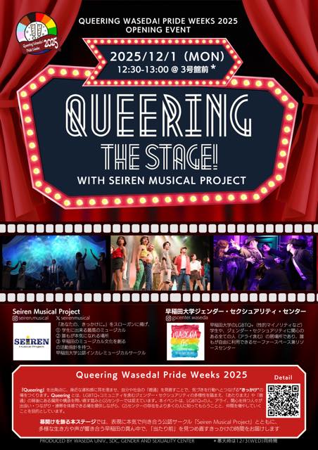 早稲田大学の「Queering Waseda! Pride Weeks 2025―早稲田で「普通」を問い直す―」は、LGBTQ+コミュニティを含むジェンダー・セクシュアリティの多様性を踏まえ、「あたりまえ」や「普通」の背後にある偏見や構造を問い直す営みとしての「Queering」を出発点に、身近な違和感に耳を澄ませ、自分や社会の「普通」を見直すことで、気づきを行動へとつなげる“きっかけ”の場をつくるイベントです。このイベントの幕開けを飾るステージとして、早稲田大学公認インカレミュージカルサークル「Seiren Musical Project」のみなさんが、歌とパフォーマンスでLGBTQ+の人々が登場する名作ミュージカルの楽曲を披露します。「多様な生き方や出会いが交差する早稲田の真ん中で、「当たり前」を見つめ直すきっかけの声を響かせます」とのことです。