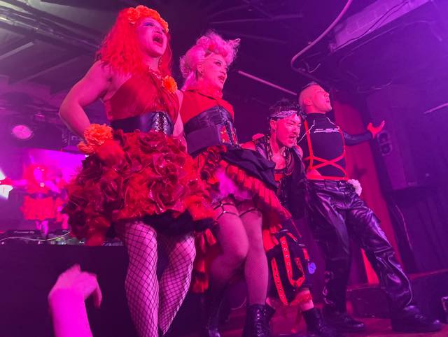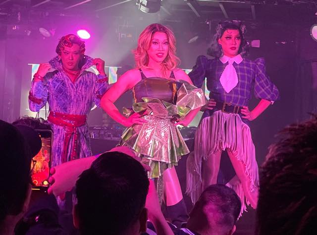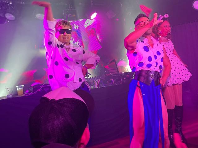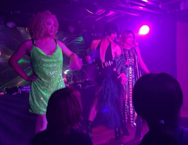 前方のスクリーンに「これからショータイムです。みなさん、フロアに座らずに、どうぞ立ったままでお楽しみください」とのアナウンスが映し出され、通常のゲイイベントではショーのときに「後ろの人たちにも見えるように前から座る」がルールになっているだけに、斬新でした。しかし、ショーが始まると、すぐにその意味がわかりました。前方のステージでダンスをしていた方たちはすぐにランウェイを歩いて右の壁のほうに移動し、ひとしきりダンスを見せて、やがてVJブースのほうに移動してフロアの後ろのほうにいた方にアピールし、かと思うと、VJブースに控えていた2番目のチームの人たちが登場し、という感じで、次々に、場所を移動しながら、キャストも交代しながらショーを見せていくのです(SHOW TIME “Roulette”というネーミングだそう)。しかも、クイーン、GOGO、ダンサーが混ざり合ってのショーで、通常のクイーンがセンターで男の子はバックダンサーという定石ではない三者が対等に目立つショーになっていたのが新鮮。音楽もENVii GABRIELLAの「ドンチー」だったり超クラシックなゲイアンセム「GOT TO BE REAL」だったり、オールジャンルでゲイ受けする曲のヒットパレードみたいな感じで、斬新だし、めっちゃ楽しかった!です(TPのフィナーレのDQショータイムのトップバッターのみなさんはここからだったんですね〜)