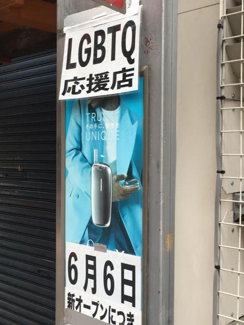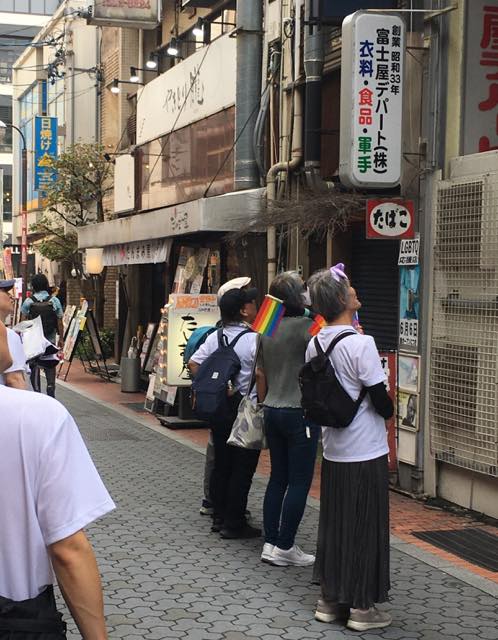 自由行動の後、再び岐阜駅に向かって歩きはじめました。復路は玉宮通りを進んでいきます。玉宮通りには、「富士屋デパート」という名所があるほか、居酒屋が並ぶ通りには、呼び込みの方もたくさんいて、レインボーフラッグやお揃いのTシャツを見て、声をかけてくれた人もいました。その「富士屋デパート」のビルに「ニューハーフバー カフェ&バーフレンズ」というお店の看板が取り付けられていて、作業をしている方とお話ができました。6月6日オープンだそうです。「今度、みんなで行きたいね」と話しながら、歩いて行きました。