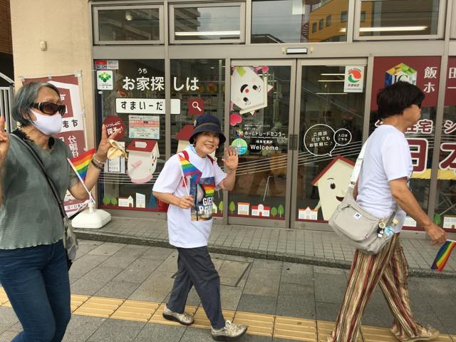 第2グループには、昨年も参加していたWさんや、大阪から参加の産婦人科医の藤田さん、10月開催のひろしまプライドパレード事務局長の木谷さんなどが歩いていました。木谷さんは岐阜の出身で、フラッグを持って岐阜の街を歩くのは感慨深いとおっしゃっていました。