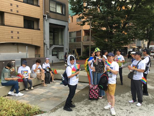 そして、駅前の休憩スペースにゴールしました。少し休憩している間、参加者どうしで交流をしていました。ゴールの記念撮影をして、解散となりました。解散後、メキシコからの観光客に声をかけられて、一緒に写真を撮った方もいました。レインボーフラッグに反応してくれたんだそうです。