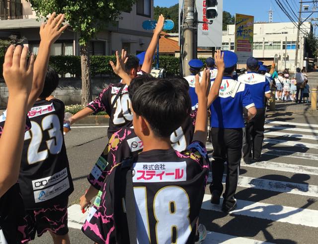 14時になり、いよいよパレードが出発。コースは、西山公園→鯖江市役所→西山公園です。先頭に横断幕を持った子どもたち。その後ろに、消防音楽隊のみなさん、その後ろにサッカーチームのみなさんが続きます。その後ろにドラァグクイーンの花華院姫子さん、Splash浣子さん、ジェラシックパー子さん、羽二重餅子さんが歩き、華を添えます。お子さんと一緒に歩く保護者の方々なども見られました。みなさん、車道を走る車に手を振ったり、すれ違う人に「こんにちは」と声をかけたりしながら、にこやかに歩いていました。気温も上昇し、かなりの暑さでした。時折吹く風が気持ちよかったです。パレードが鯖江市役所へ到着すると、隣接する消防署の職員の方も手を振ってお出迎えしてくれました。ここで1回目の記念撮影をしました。市役所をバックに代表の方の掛け声とともに、カメラを持った方々がシャッターを切りました。少しの休憩を挟んで再び西山公園へ向けて出発しました。1回目のパレードは市役所から西山公園だったのですが、2回目の今年は、その倍の距離を歩きました。トータルで30分弱の所要時間でした。パレードが西山公園へ向かって進んでいくと、さばえまつりに行こうとする人や、西山公園の遊歩道を歩く人なども注目していました。撮影の途中、「何のパレードだろう?」と話す方がいらっしゃったので、カメラマンの秋山さんが丁寧に説明していました。そうしてパレードは西山公園へ戻ってきました。少し休んで2回目の記念撮影をしました。みなさん素敵な表情でした。最後に代表の方から挨拶があり、パレードは終了しました。