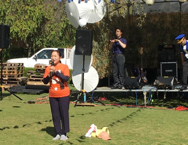 昨年は雨のため中止となってしまい、たいへん残念でしたが、「昨年の分も!」というみなさんの思いが届いたような快晴のなか、会場の西山公園にはたくさんのキッチンカーやフリーマーケット、雑貨販売などのブースが出ていました。パレードを企画した「なろっさ!Allyさばえ」もブースを出展し、各種パンフレットの配布や書籍の展示などをしていました。会場中央にはやぐらが組まれ、夜には盆踊り大会が開かれたそうです。