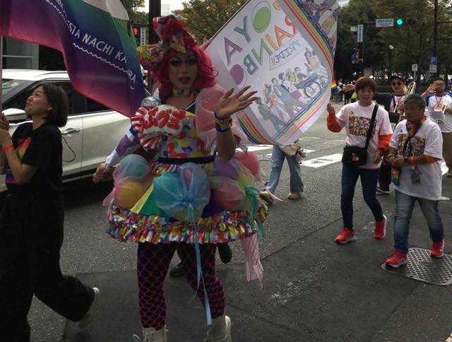 続いてスイカフロート。このフロートは公式生配信もしていて、配信MCのかんだーにゃさんがパワー全開でマイクアピールしていました。同じくMCのフェアリーシスターズのお二人は先頭を歩いていました。会場に来れなくても、配信を見ながらパレードに参加できる九州レインボープライドの素敵なシステムです。三井住友トラストグループのみなさん、資生堂のみなさん、三好不動産のみなさんなども歩いていました。