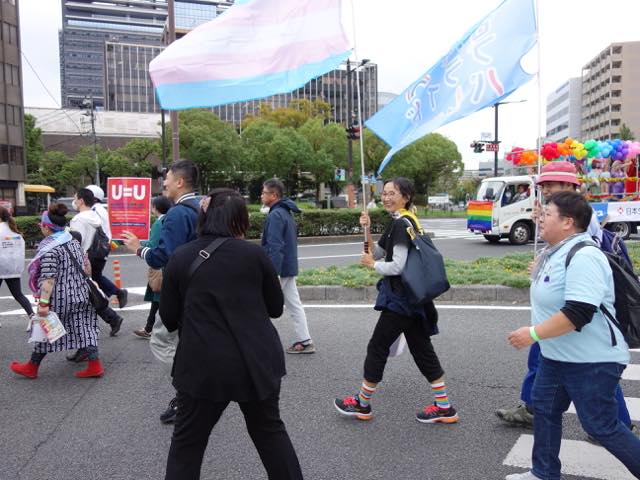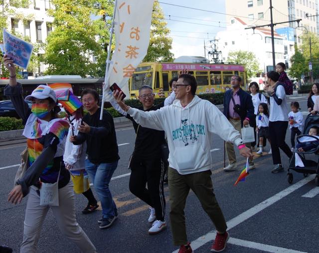 今回は公園を出て西川緑道に沿って移動し、桃太郎大通りまで出てからフロートが合流し、パレードがスタートするかたちでした。先頭は実行委員会のみなさんで、東商業高校のマーチングバンドのみなさん、JPN(各地のプライドの主催者)の方たちなどが続き、その後エスムラルダさんやセシルさんが乗ったDJフロートとヴォヴォカさんやマチコ・ミラーさん、GOGO GIRL(今回初登場)の方たちが乗ったDJフロートが盛り上げて、最後尾が撮影禁止ブロックとなっていました(昨年、素晴らしいフロートで盛り上げたちくわフィルムのみなさんは、今回、撮影禁止ブロックでの参加でした。それでも大勢で歌ったりしながら歩いていました)