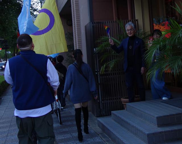 国道30号線沿いに南下し、中央公園の交差点のところで階段を降り、金色のオブジェがある光の広場を通って再び地上に出て、国道11号線沿いに東に進み、ライオン通商店街に入りました。お店の前に出てレインボーフラッグを振ってくれる方もいたり。逆に商店街にいた方たちのなかには怪訝そうな顔で見ている方もいたり。昭和を感じさせるお店がたくさんあって、趣がある商店街でした。