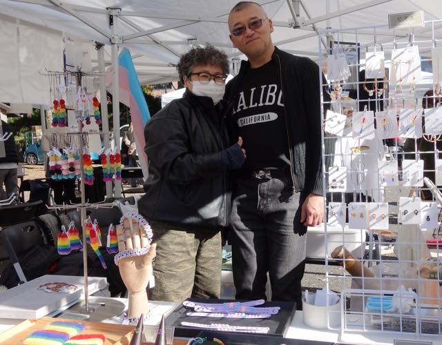 かれこれ20年くらいレインボーアクセサリーを手作りし、パレードや映画祭でブース出店し続けてきたniji-depot。今回、ぐみさんが体調不良のためお休みしていて、うめさんが寂しそうにしていました(ゲイのお手伝いさんが頑張ってました)