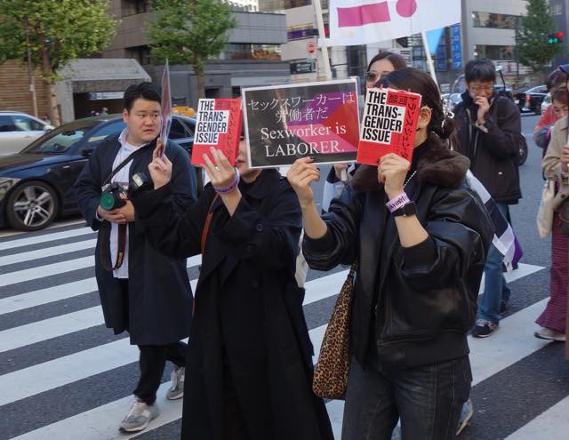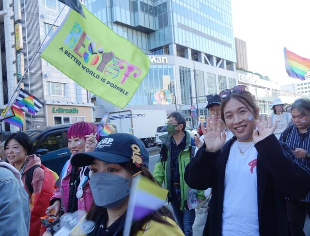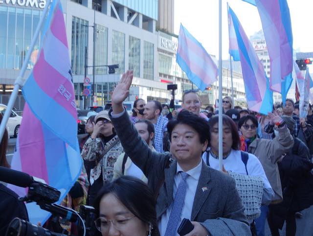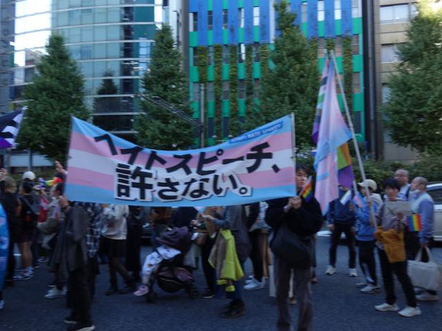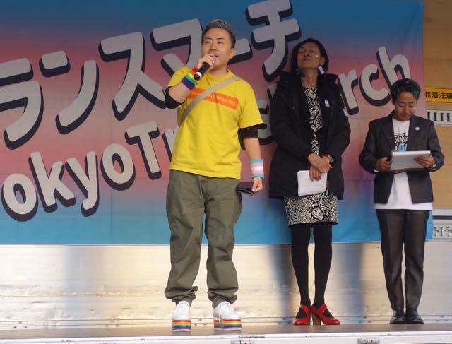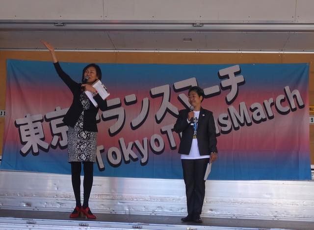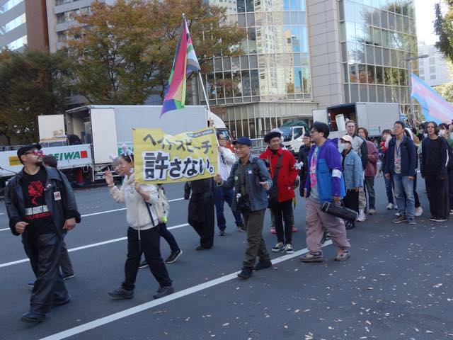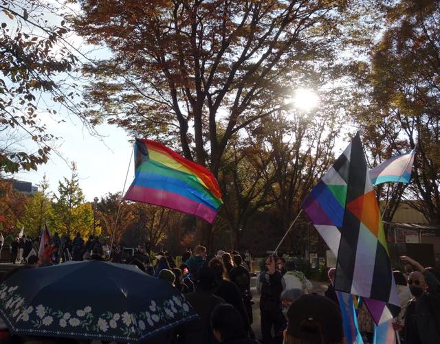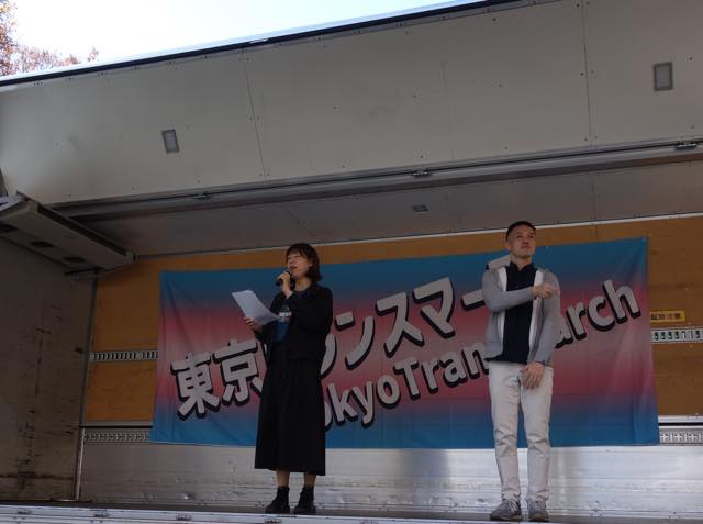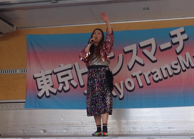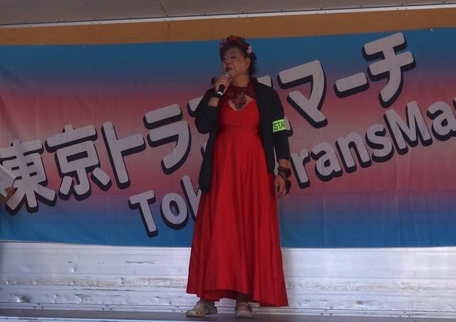 続いて、韓国で初めてトランスジェンダーであることをカムアウトして活動する弁護士の朴韓熙(パク・ハンヒ)さんが来日し、急遽スピーチをしました。初めてトランスマーチに参加できて光栄です、韓国のコミュニティから日本のコミュニティへの連帯を、韓国でも性別変更に手術が必要で、同性婚ができない、本当の自分として生きられないというのは日本に似ています、ヘイトが激しく、主に保守的キリスト教の人たちですが、その主張が嘘であること知ってますよね、性別変更のために手術を強制することが違憲だとする判決も地方から出ています、共に闘う人が大きな勇気を与えます、韓国でもトランスマーチがあります、この街にいるということを示すために歩きます、「叩けば叩くほど私は響く」という言葉があります、全ての人が幸せに生きられるようになるまで力強く歩みを続けましょう、といったお話しでした。