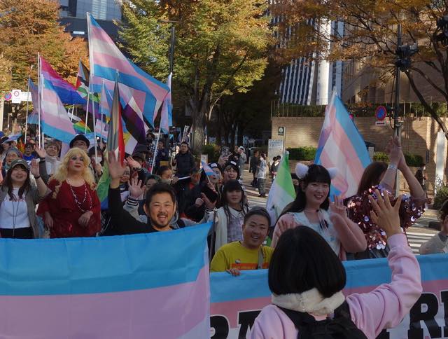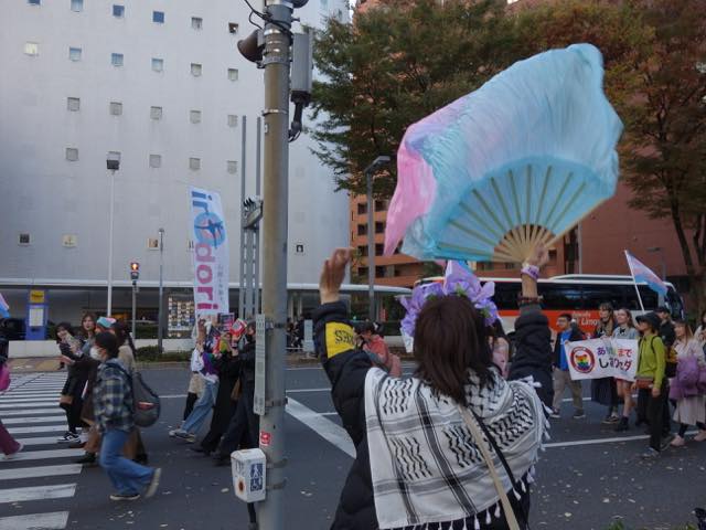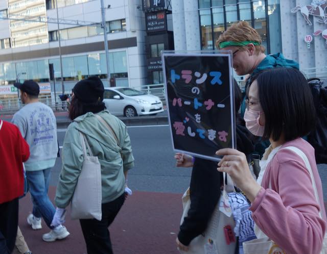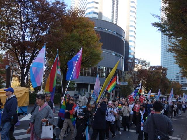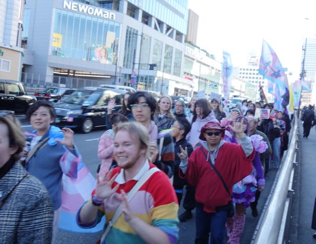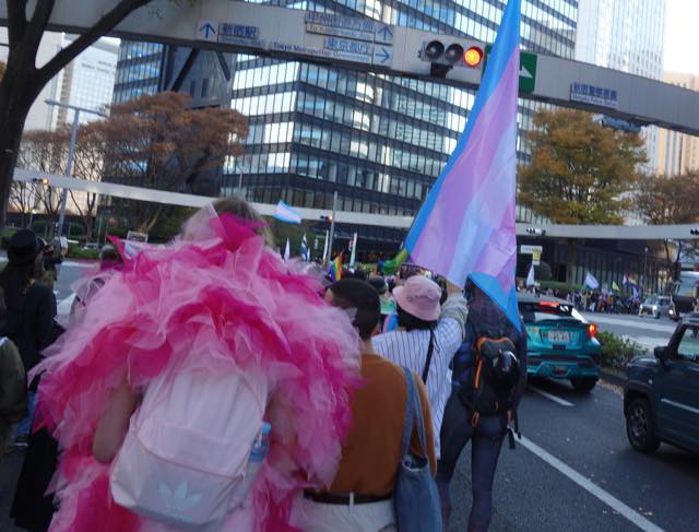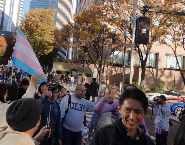 マーチは甲州街道をゆっくり進みます。警察官の方たちも親切でした。万が一トランスヘイターなどの妨害があったときにも対応できるよう、アライの男性たちがたくさんスタッフとしてマーチについていました。おそらく当事者の方で、マーチには参加せず、伴走しながらトランスカラーの旗を振る方などもいました。