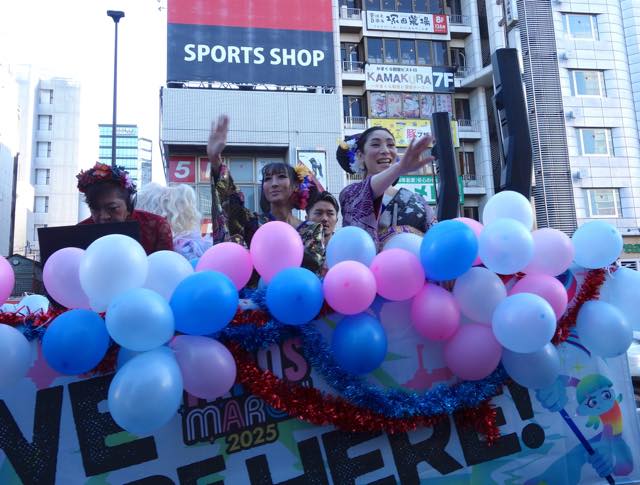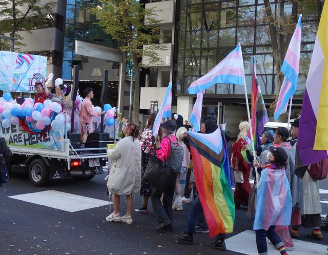 13時にマーチに向けて移動が始まりました。角筈橋が出発地点になっていて、みなさん、そちらに向かいました。13:30、いよいよマーチがスタート。フロートには美しい華魁のいでたちの蝶羽さん、美羽さん(よだかれんさんがダンサーだった頃に一緒に踊っていた方たちだそう)、ドラァグクイーンのラビアナさん、FTM GOGO/DANCERのSHOW-1さんらが搭乗し、とまとさんがDJで盛り上げ、ときどきマイクでも「素敵な仲間たちと一緒に歩いています」といったアナウンスをしていました。たぶん500名近い方たちが歩いていたと思うのですが、後ろの方では「We're already living together」「一緒に生きよう」などのコールをしていました。