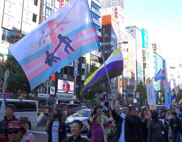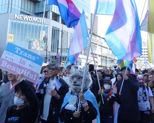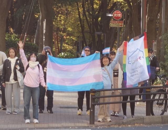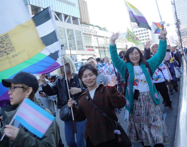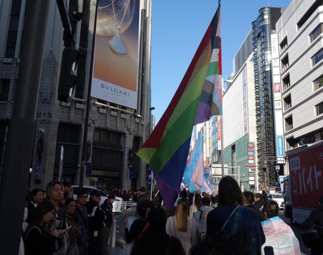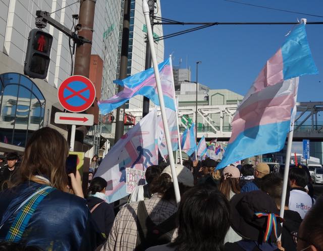 今回はマルイが協賛してくれました。マルイは10年近く前からトランスジェンダーなどの就活生に性自認に合ったスーツを着られるような取組みを展開したり、TRPにも多大な協賛をしてくれたり(渋谷のMODIがレインボーになったこともそうですし、2018年には渋谷駅前からパレード出発地点まで数百名分のOUT IN JAPAN写真のバナーが並び、感動を誘いました)、新宿三丁目のマルイメンが1階にレインボーフラッグを掲げたり、TOKYO LOVE PARADEのアフターイベントとして会場提供してくれたり、そのLGBTQコミュニティ支援の例は枚挙にいとまがありません。今回はトランスマーチに際してマルイ本館・マルイアネックス・マルイメンでトランスジェンダーミニフラッグを掲げているそうです。
