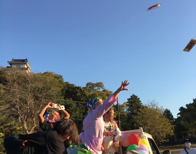 そして(レインボーフェスタ那智勝浦でもちほりをしているような感じで)フィナーレの「菓子まき」が行なわれました。東郷潤さん&結香さんらが景気よくたくさんのお菓子を撒いて、広場にいた方たちが手を伸ばして受け取ったり拾ったりしてお菓子をゲットし、盛り上がっていました。