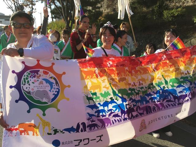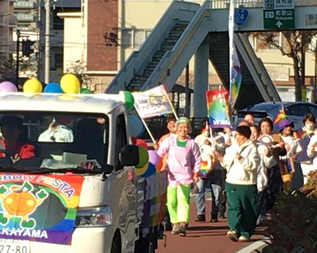 14時30分、パレードがスタートしました。先導車の後ろでは東郷潤さん&結香さんが「HAPPY PRIDE」と盛り上げ、明るいムードにしてくれていました。その後ろには、チーム紀伊水道のみなさん、全国のパレードに参加している野本さんカップル、岡山レインボーフェスタのみなさんが続きます。産婦人科医の藤田さん、Marriage For All Japanの方、アドベンチャーワールドのみなさん、よさこいのみなさん、チェリオのみなさん、ゆいにゃんさんらも参加していました。ゆいにゃんさんはメガホンを忘れてしまったそうですが、メッセージを伝えながら歩いていました。毎回、感動させられます。