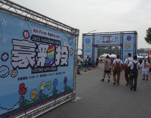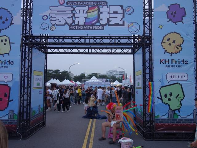 休日の高雄市議会前駅にいたのはほぼ全員、プライド参加者でした。外に出ると、すぐ目の前に「豪彩投(VOTING WITH PRIDE)」というテーマが大きく描かれたパネルとゲートが見えました。ゲートを潜ると、ブースが左右に並び、奥のほうにステージが見えました。