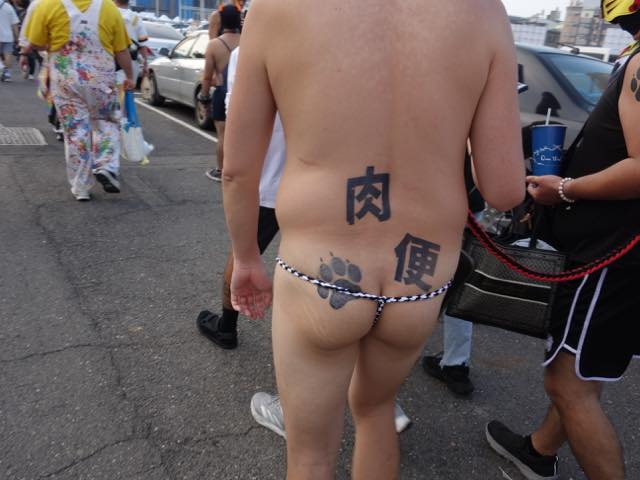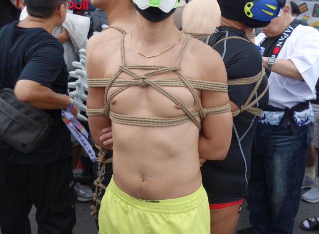 一方、「ミキサー」のブースの前では縛りが始まっていました。パピーたちが塊で縛られてて、その横で「世界唯一の同性の恋愛を応援する神」の「神輿入り」とかが始まって、なかなかのカオスでした。面白かったです。