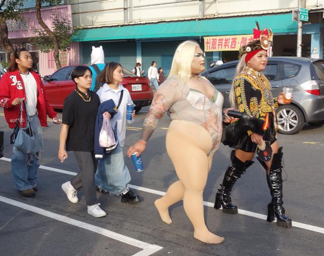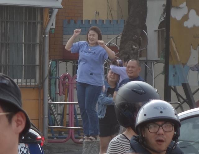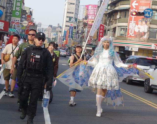 市街地(澄清路)に出ると、沿道にも人が結構いて、なかにはめっちゃ踊って応援してくれてる女性がいたりして、フレンドリーさを感じました。総統文化賞も受賞しているレジェンド、祁家威(チー・ジアウェイ)がレインボーフラッグを振っている姿も見えました。