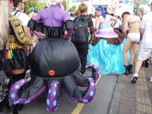 信号の関係で途中で何回か停まりましたが、その間にフロートの前でball(vogue femmeのパフォーマンス)が繰り広げられたりもしました。気づけば「ミキサー」のフロートに六尺の男子たちが乗ってたり。