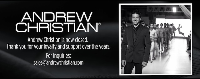 20年超の長きにわたってアイコニックなゲイのアンダーウェアブランドとして人気を博してきたアンドリュー・クリスチャンが3日、店じまいしたことがアナウンスされました。公式サイトにはショーの写真と共に「アンドリュー・クリスチャンはクローズしました。長きにわたるご愛顧、ありがとうございました」とのコメントが掲示されています。