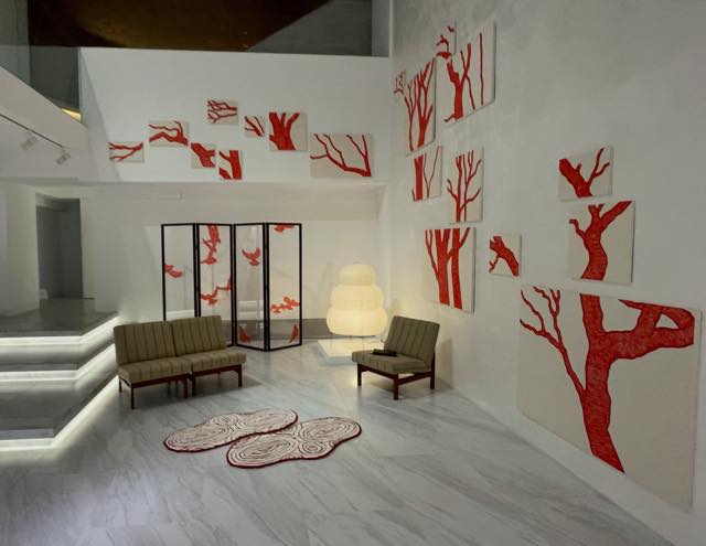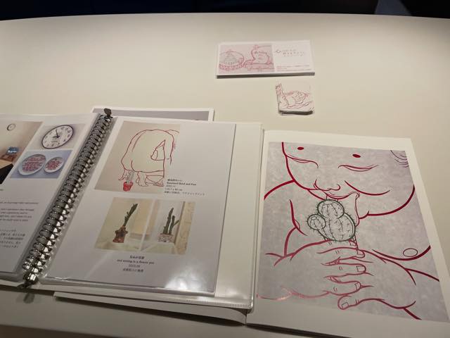 2階に上がると(2階には階段でもエレベーターでも行けます)、やはり椅子やマットが置かれたスペースがあり、そこには作りかけの刺繍セットや刺繍糸が置かれていたりして、「私が座ってくつろぐための場所」ではなく、「誰かがそこにいた痕跡」のような息遣いが感じられる空間になっていました。そして、大きめの絵画や立体作品(花器など)がたくさん展示されていました。封筒の宛名面に極細の赤いペンで描かれたシリーズが特に印象的で、自分自身の憎悪の重さにつぶされそうになってる絵だったり、手首から血があふれている絵だったり、生々しい痛みや叫びが描かれていて、目が離せませんでした。ずっと見入ってしまいました。