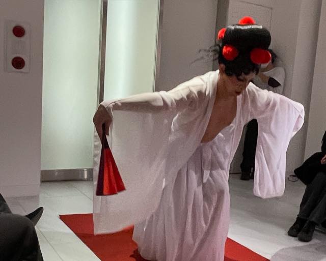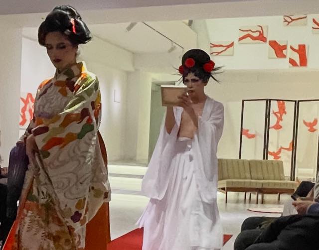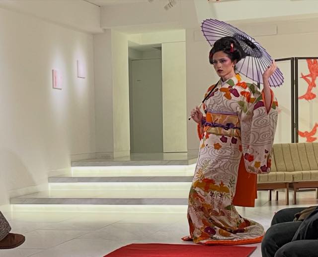マレーシア出身であるというネルソン(Nixie Humidity)は、おそらく民族衣装かと思われる白い装束に身を包み、胸をはだけ、赤い花をあしらった女性の髷のかつらと、京劇オペラ風のメイクといういでたちで登場し、ビリー・アイリッシュの「BLUE」などをBGMに、ときにゆったりと空を見つめたり、ときにリズムに乗ってダンスしたり、というパフォーマンスを披露しました。続くAndromedaさんも、やはり日本髪の島田のかつらと鮮やかな着物姿で(透明なラインストーンが散りばめられていてキラキラ光って見える、衣装としての着物でした)長唄に合わせて本格的な日本舞踊を披露しました。そのあと、さっきとは反対の側からネルソンが登場し、Ballroomカルチャーへのリスペクトを示すかのようなダンスをひとしきり踊ったあと、Andromedaさんと合流し、用意してあった小さなキャンバスと筆を手に持って、Andromedaさんを見つめながら何かをキャンバスに描く、というパフォーマンスを繰り広げました(あとで見たら「美」という文字だったりしました)。会場の観客のみなさんから大きな拍手が贈られました。観てよかったと思えました。