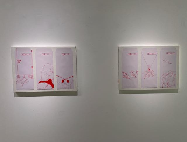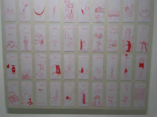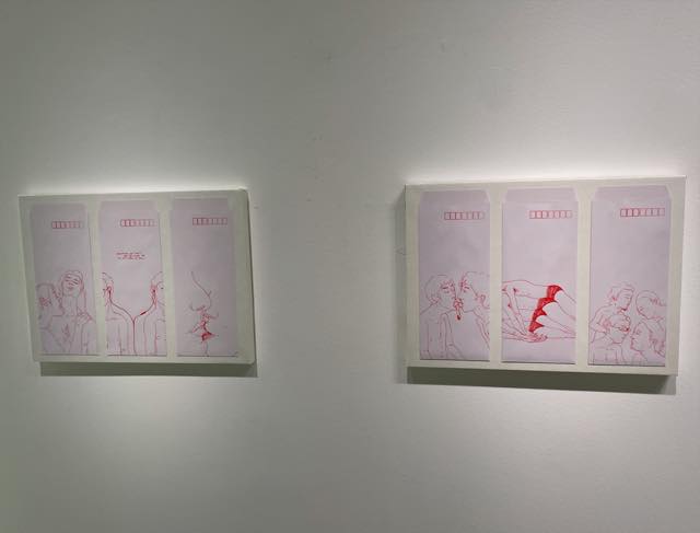 ネルソン・ホーの作品には、イスラム社会で経験してきたゲイとしての痛みの記憶が刻まれていると感じました。しかし、赤で統一された線で描かれたそれらは、もっと普遍的な、世界中どこに展示されても伝わるような表現であり、封筒のシリーズなどは、それがもしポストカードにさらさらっと描かれていたらヨーロピアンなオシャレ作品になるんじゃないかと思うようなタッチでした。繊細で傷つきやすく、感受性が高い方だと思いますが、しかしその痛みを、決してどぎつくはならないような「品の良さ」でもって作品に昇華させている、そんな謙虚さといいますか、清潔な距離感とでも言うべき感性を感じさせました。