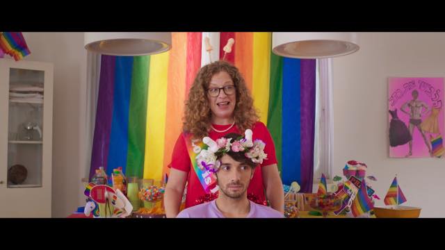カミングアウト1周年おめでとうと言ってLGBTQの友達が家に集まって、ママがレインボーフラッグを飾ったりレインボーなケーキを用意したりして、嫌味なくらい大げさにお祝いするパーティと、それを冷めた目で見ているナダヴィの対比とか、急におばあちゃんが家に来ることになったときのホラー映画ばりの音楽とか、みんなで急いでレインボーカラーのものをしまったりとか、そういうドタバタ感が笑えるコメディです。果たしておばあちゃんは孫がゲイだと気づくのか、そしてそれを受け容れるのか…?とハラハラドキドキさせられますが、最後に思わぬ展開が待っています。