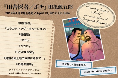 ゲイコミックの巨匠・田亀源五郎さんの新刊単行本『田舎医者/ポチ』が発売されました。『バディ』誌に発表された作品、お蔵出しの旧作、描き下ろしの作品も入って、バラエティに富んだ田亀ワールドを堪能できる一冊です。