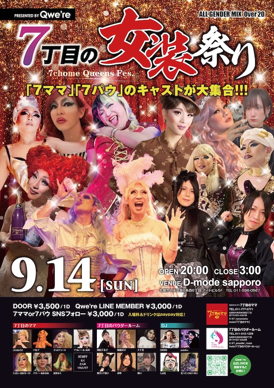 DRAG QUEEN:渦潮つば子、UNDINE、加藤アゴミサイル、クアラルンプール・とき子、Jackie The Sun、DIANA EXTRAVAGANZA、DaDa、CICCONE、Dita Starmine、肉襦袢ゲブ美、のぼる.co、バビ江ノビッチ、プリズム、ベビーヴァギー、頬紅ちー子、Rachel D’Amour