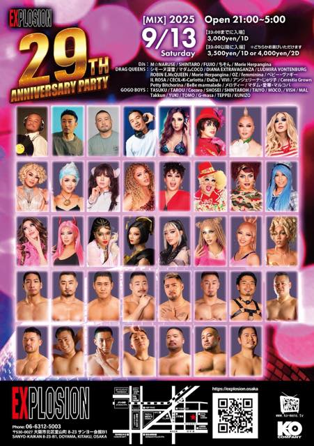 今や日本で最も古い歴史を誇る(同じ場所で同じ名前で営業している)ゲイクラブ「EXPLOSIN」。これまでに数々のDJ、ドラァグクイーンやGOGO BOYなどを輩出し、数々の素敵イベントが開催され、関西のゲイシーンの中心地としてにぎわってきました。毎年9月のこの時期に開催される周年パーティは、年末のカウントダウンと並び、EXPLOSIONにゆかりのあるキャストが総出演する華やかなイベントになっています。今年もシモーヌ深雪さん、マダムCOCOさん、ダイアナさんといったレジェンドから新人クイーンさんまで19名、GOGOもTASUKUさん以下15名、DJもゲストのM☆NARUSEさんはじめ5名が出演します。素晴らしくゴージャスなイベントです!