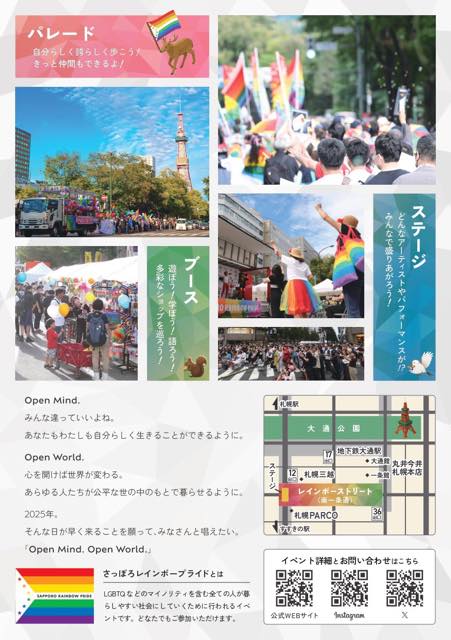 夜には札幌のシンボル・テレビ塔がレインボーカラーにライトアップされるほか(パートナーの方と行くと本当に幸せな気持ちになれると思います)、地元のDQやGOGO、DJさんたちが熱く盛り上げるアフターパーティや「7丁目の女装祭り」も開催。そのほか、レインボーファミリーカフェなど多様な関連イベントもあります。