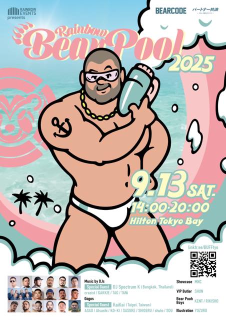 VITA Pool 2025のレポートでもお伝えしましたが、13日(土)にヒルトン東京ベイで「Rainbow Bear Pool」(愛称:ベアプー)が開催されます。大人気のBear系キャストが集合するのはもちろん、台北からGOGOのKaiKaiくんがゲストで登場したり、いろんなクマさんがスタッフで参加する水着ブランド「髭とハチドリ」のブースや、ジムウェアブランド「THRUST」のブースも出店されるそうなので、お楽しみがいろいろです。プールの後は、二丁目「D-light, Tokyo」で開催の「AfterBears」を楽しみましょう。
