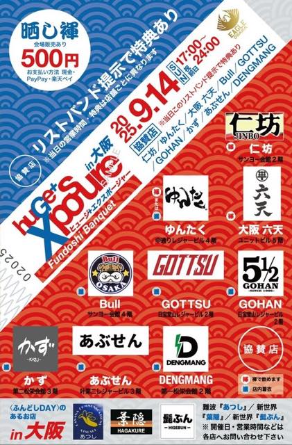 昨年3月に堂山にオープンし、西日本最大級(3フロア)のゲイバーとして新たな人気スポットとなった「EAGLE OSAKA」ですが、今回初めて、二丁目の人気イベント「huge+ Xposure ふんどしBanquet」が出張開催されることになりました。1Fはクラブスペース、2Fはバースペース(お客様参加型ゲームも開催)、3Fはクローク+スペシャルコーナーで、いろんなフロアを行ったり来たりして楽しめます。お客様参加型ゲームに参加してくれた方にはホテルパームロイヤルNAHA無料宿泊券やmarukyuのストレッチ褌、日本男児のオリジナル黒猫や手拭い、イベントオリジナル木札などが当たります(豪華!)。大阪初上陸のキャストも多く、東京からこのために大阪に行くがちむち勢も多いので、素敵な東西交流ができそうです。また、「huge+ Xposure」自体は24時までなのですが、堂山のバー9店舗が協賛し、リストバンド提示で特典が受けられるほか、引き続き褌飲みが楽しめるお店もあります(「六天」「仁坊」「ゆんたく」さん)。三連休の中日、堂山の夜をめいっぱい満喫しましょう!